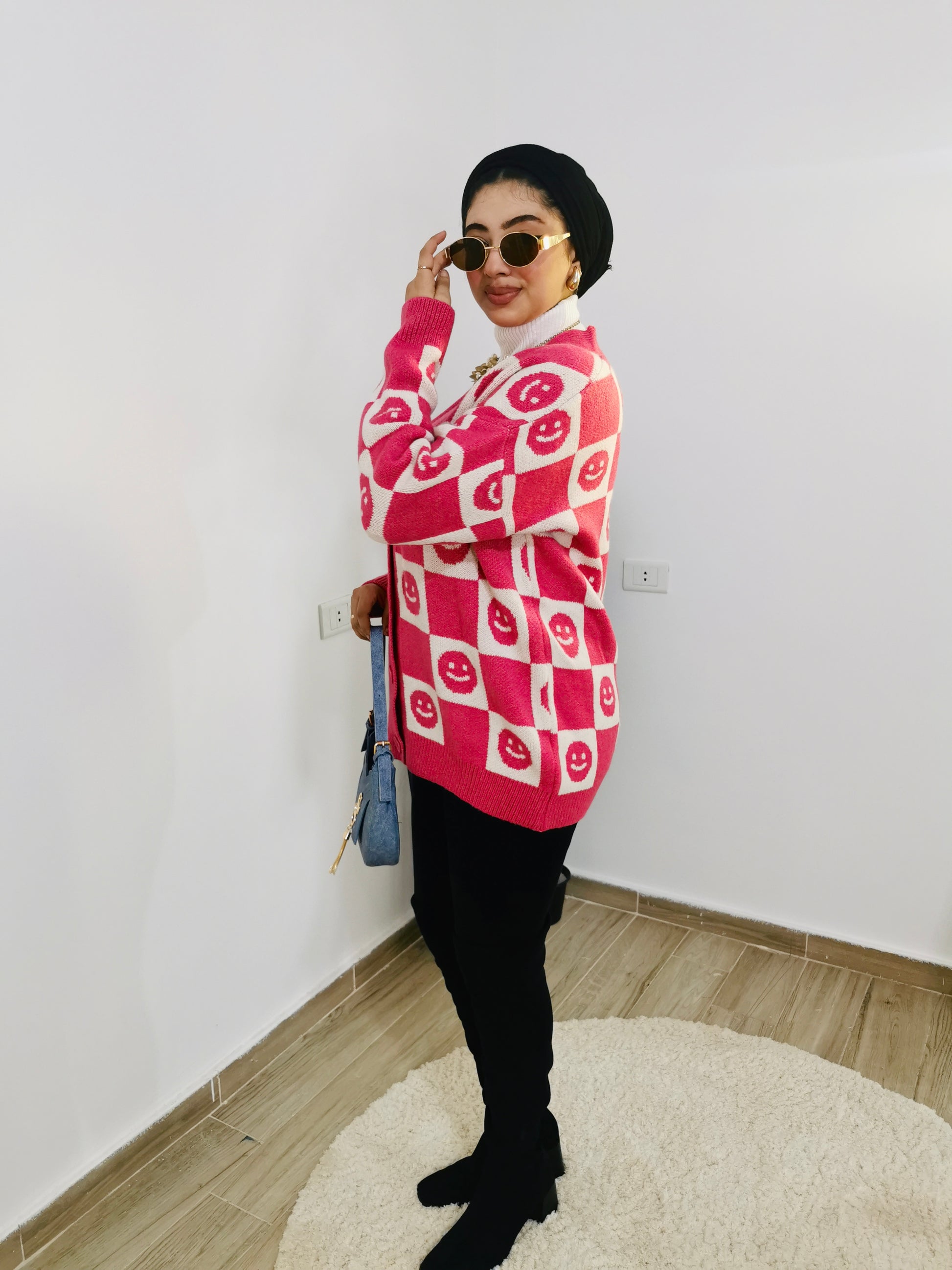 Playful pink jacket with smiley designs, vibrant and cheerful, trendy statement piece, fun and youthful vibe, casual and comfortable, perfect for adding positivity to your look, soft and cozy fabric, eye-catching and unique, ideal for all-day wear, stylish and expressive, bold pop of color, fashionable and fun outerwear, versatile for casual outings or playful events
